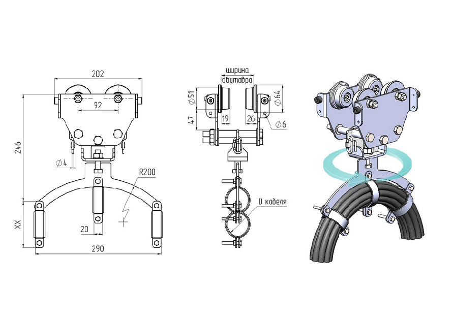 Кабельная тележка или кабельная каретка — предназначена для подвода питающего кабеля к мостовому крану, кран балке или тельферу.