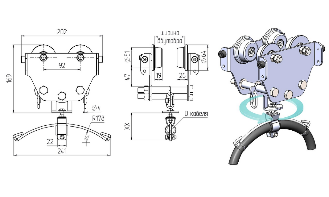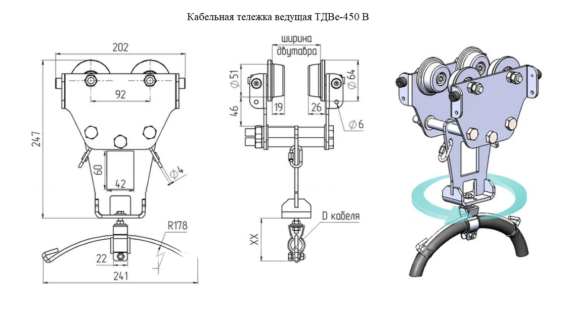 ТДВе-450 — это кабельная каретка для перемещения круглого гибкого кабеля по двутавровой балке. Тележки ТДВе предназначены для организации кабельного токоподвода к кранам и другим движущимся механизмам.