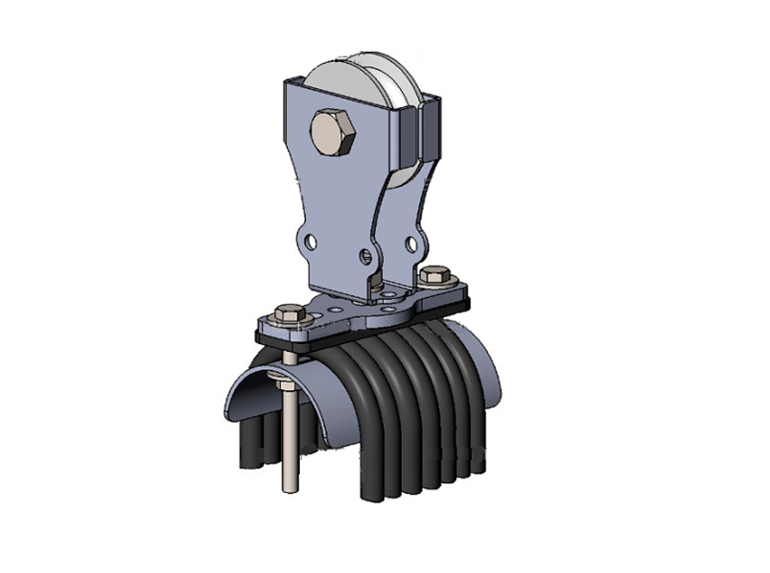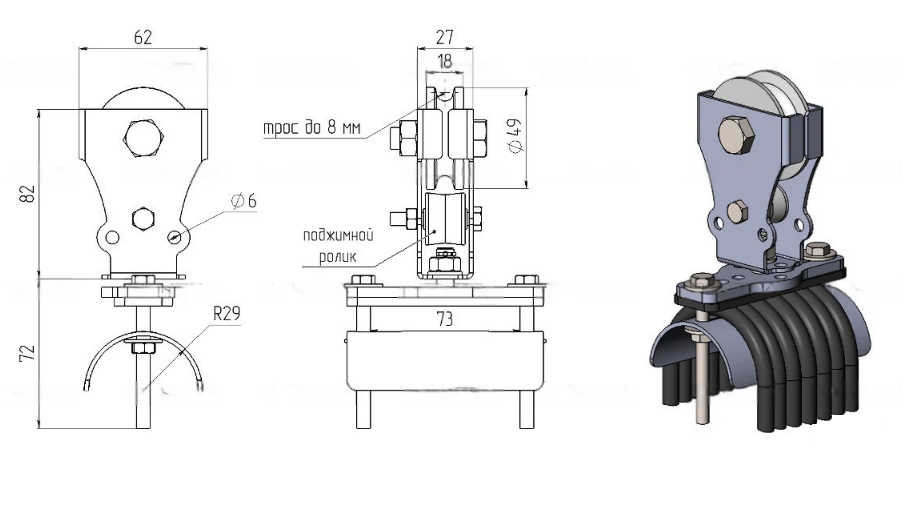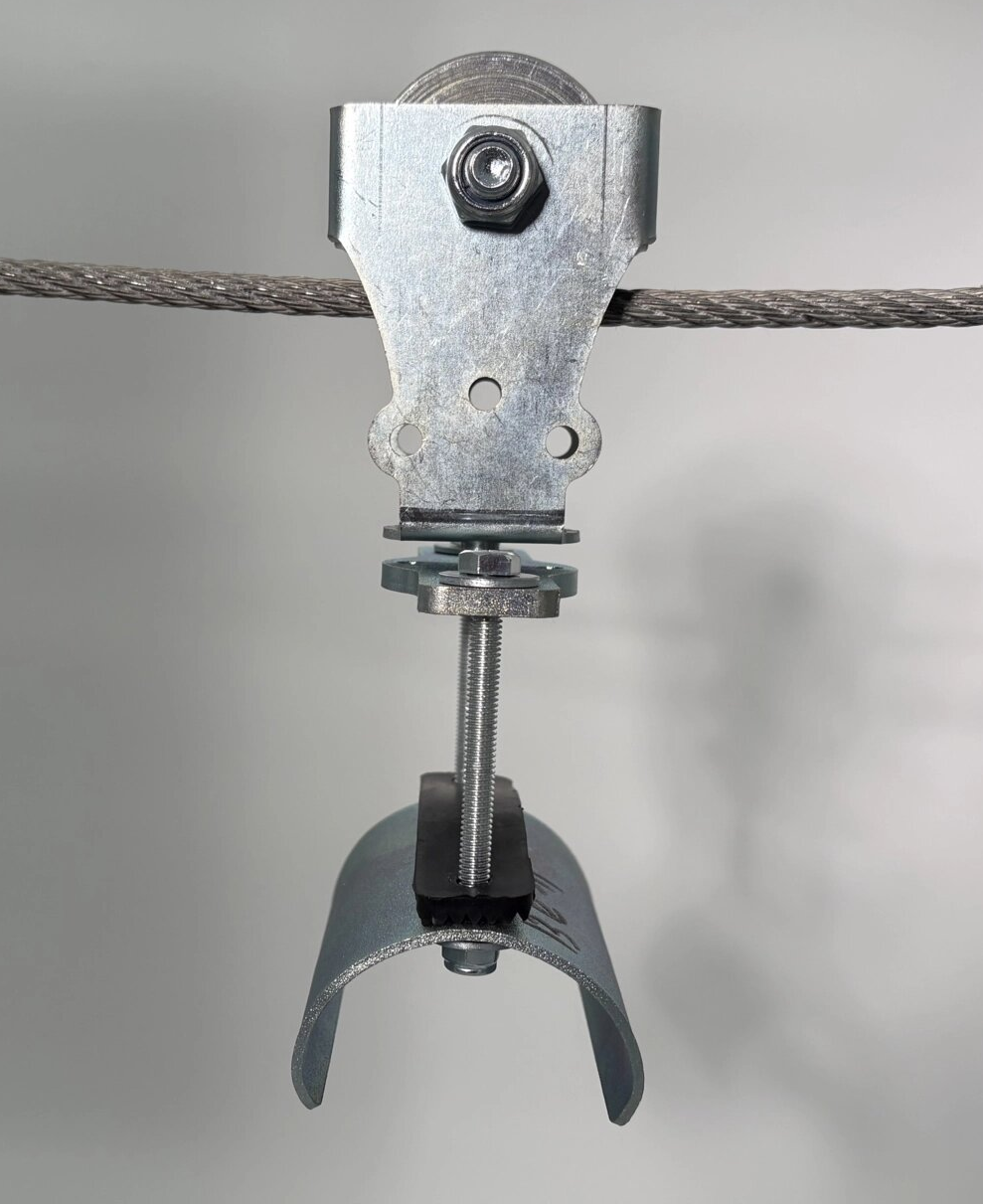 — поджимной, стальной ролик который устанавливается снизу, предотвращает подъем и соскакивание подвеса с троса.