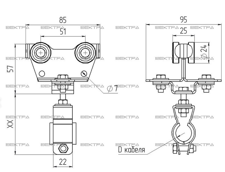 Серия кабельных тележек СВ-10 предназначена для перемещения круглого кабеля типа КГ или КГН диаметром до 50 мм по С-рельсу.