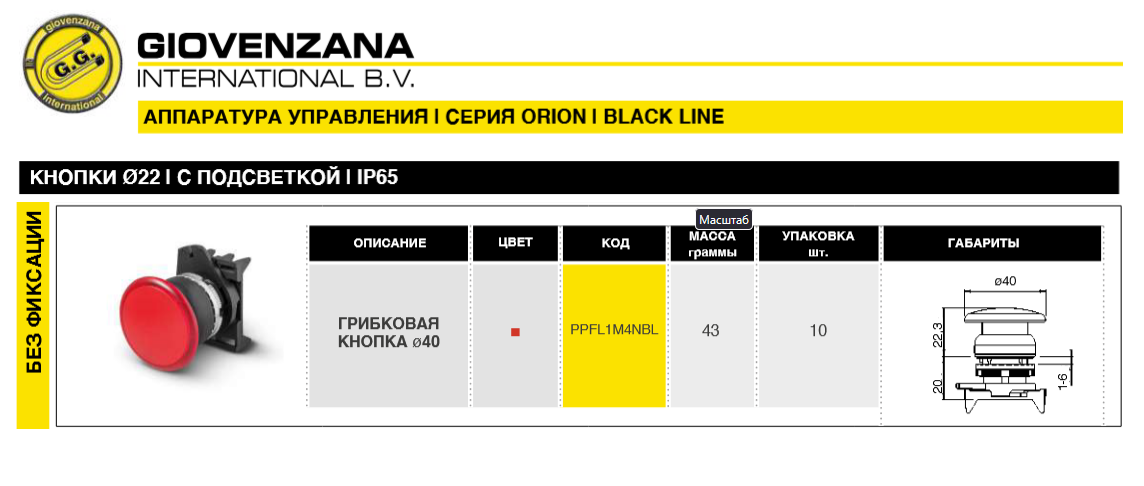 Кнопка аварийной остановки PPFL M4NBL грибковая ø40 без фиксациии: