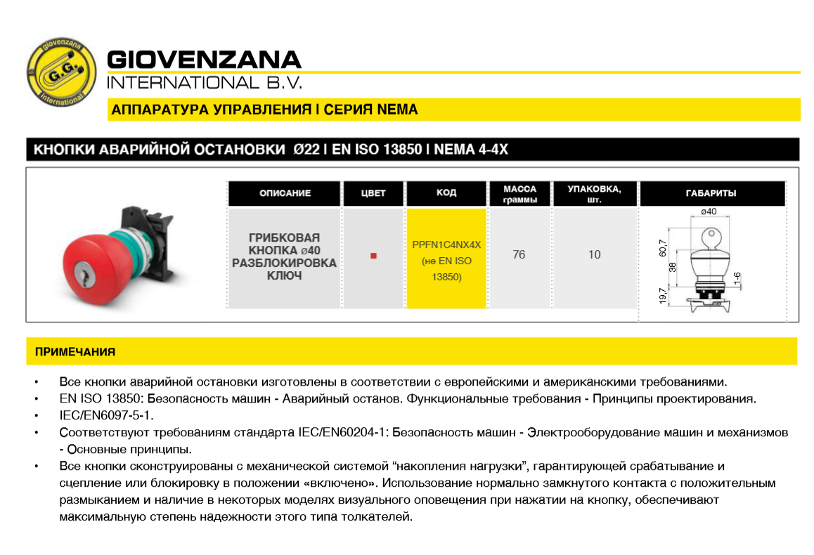 Кнопка аварийной остановки PPFN1C4NX4X имеет следующие характеристики: