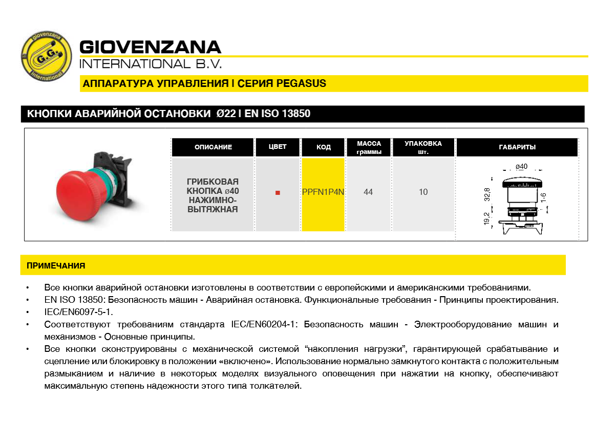 Кнопка аварийной остановки PPFN1P4N имеет следующие характеристики: