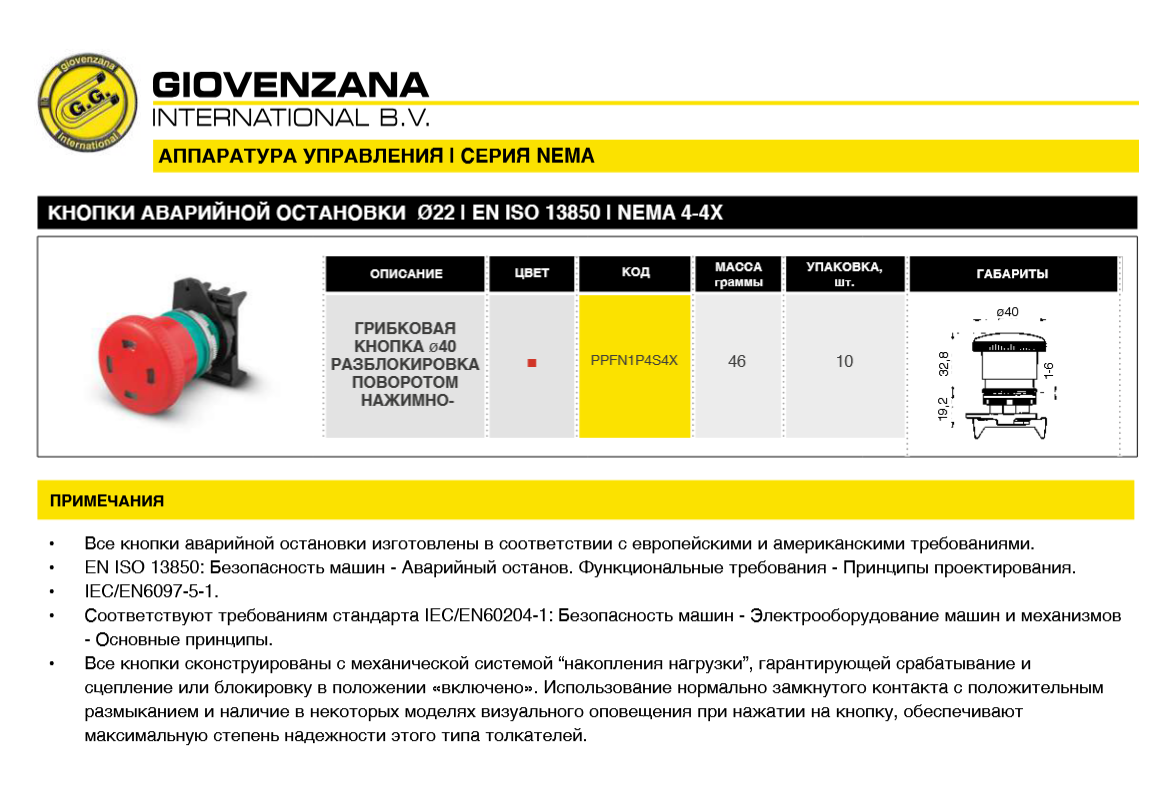 Кнопка аварийной остановки PPFN1P4S4X имеет следующие характеристики: