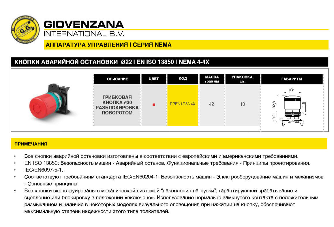 Кнопка аварийной остановки PPFN1R3N4X имеет следующие характеристики: