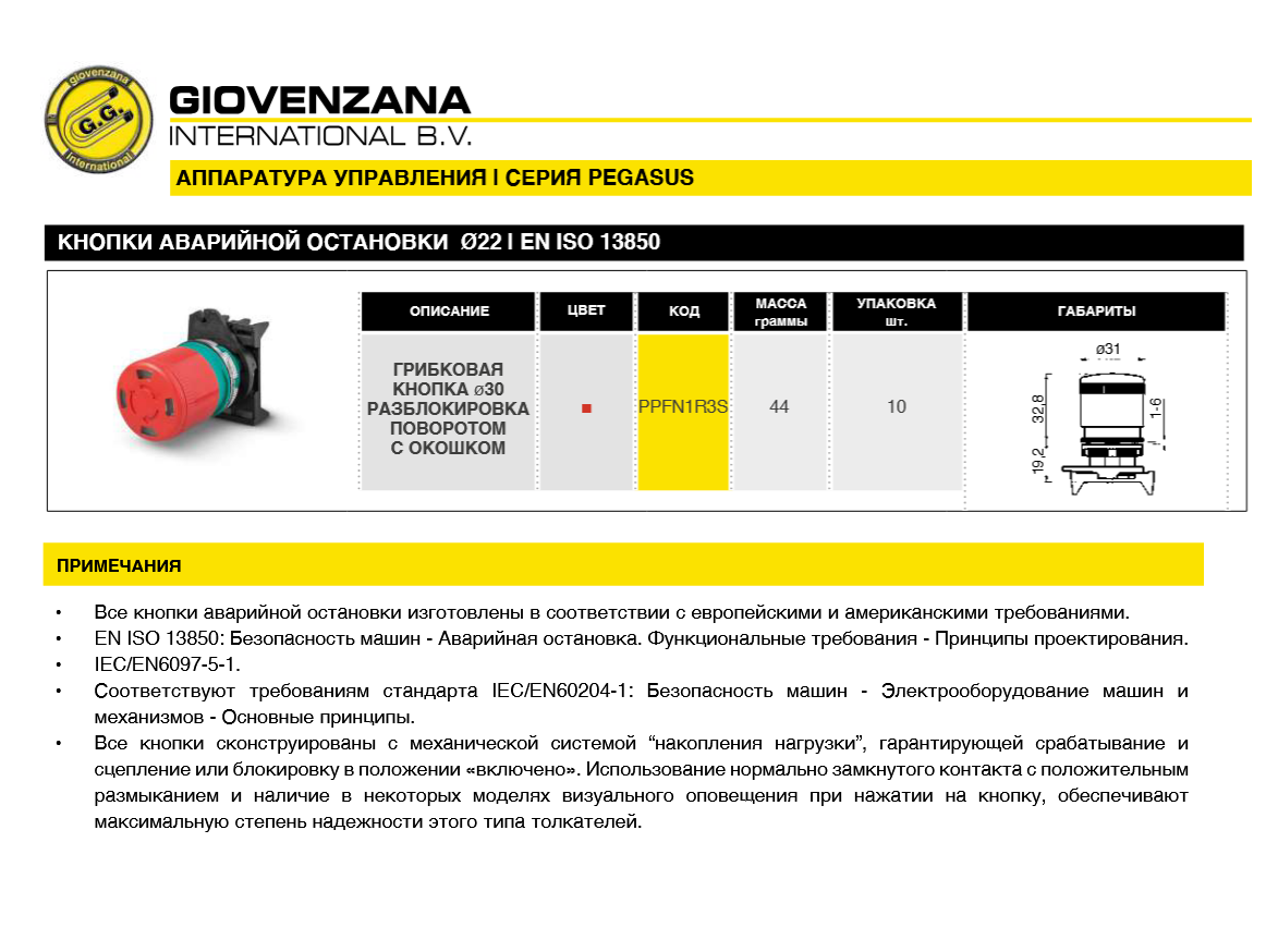 Кнопка аварийной остановки PPFN1R3S имеет следующие характеристики: