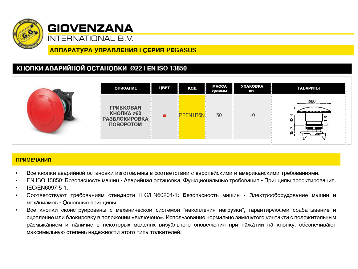 Кнопка аварийной остановки PPFN1R6N имеет следующие характеристики: