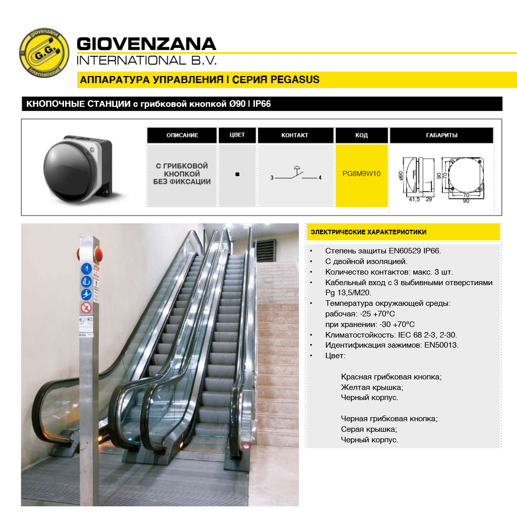 Кнопочная станция PG8M9W10 с кнопкой ø90 без фиксации имеет следующие характеристики: