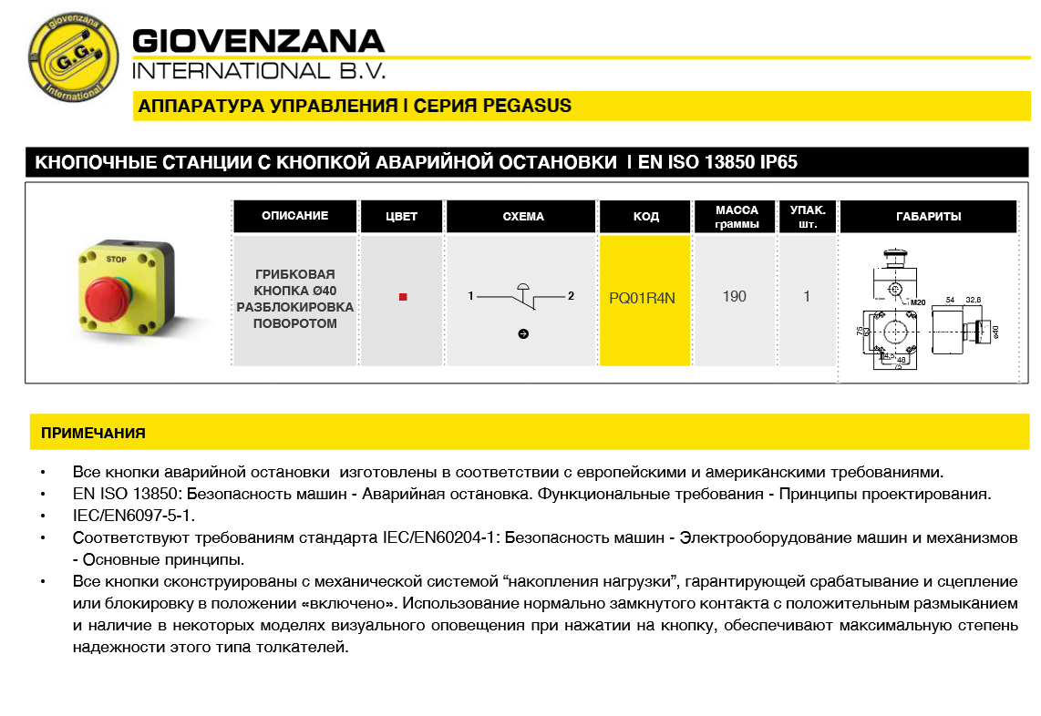 Кнопочная станция PQ01RN с кнопкой без фиксации имеет следующие характеристики: