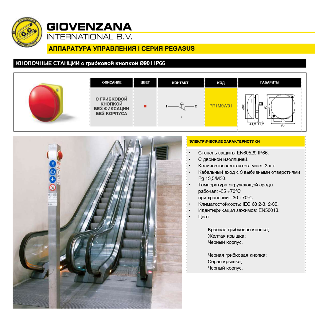 Кнопочная станция PR1M9W01 с кнопкой ø90 без фиксации имеет следующие характеристики: