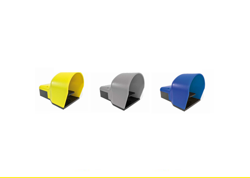 Защитные педальные переключатели из термопласта оснащаются крышкой с кожухом, предотвращающим непроизвольное или случайное срабатывание вследствие падения инструмента или нажатия ногой; резиновые ножки защищают от скольжения, а встроенное механическое устройство блокировки предотвращает срабатывание в случае неполной установки ступни на педаль.
