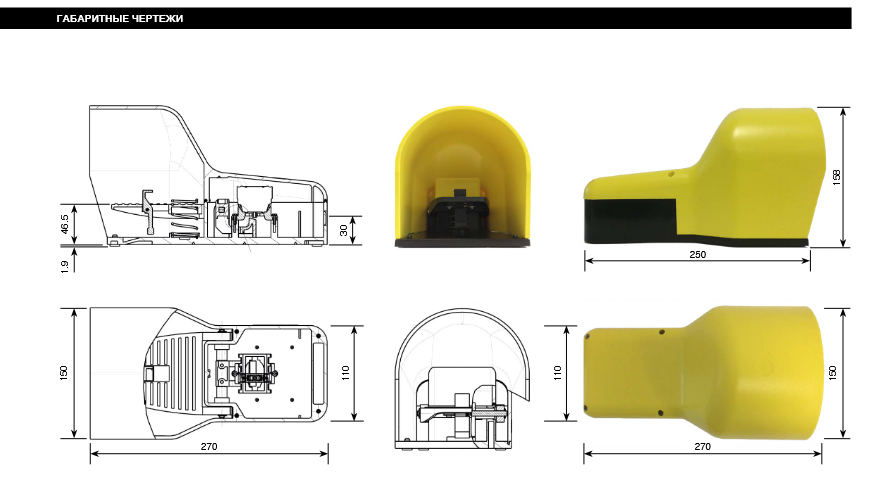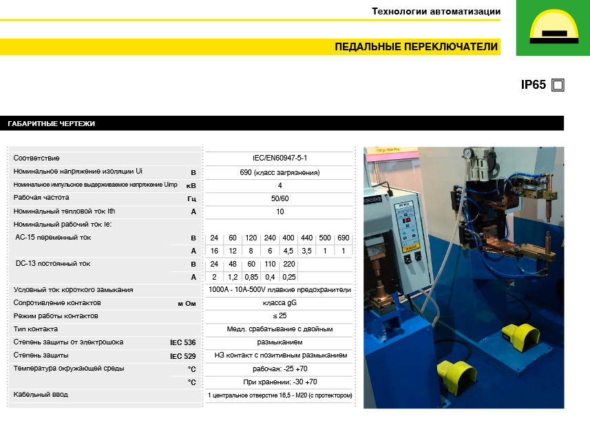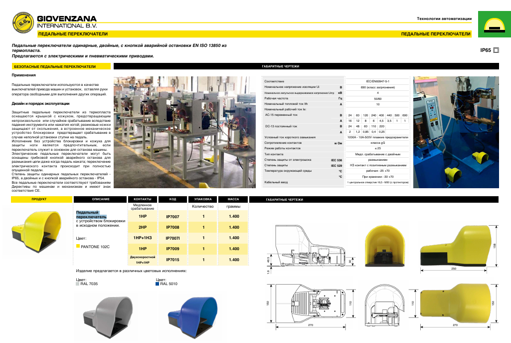 Степень защиты одинарных педальных переключателей — IP65, а двойных и с кнопкой аварийного останова — IP54. Все педальные переключатели соответствуют требованиям Директивы по машинам и механизмам и имеют знак соответствия CE.