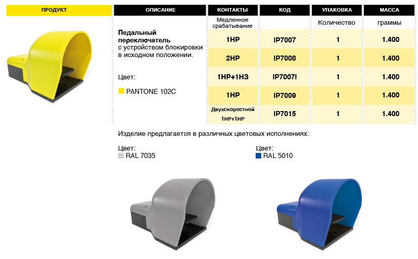 Переключатель ножной педальный IP7009 (1НР) – это педальный переключатель с устройством блокировки в исходном положении (1НР). Изделие предлагается в различных цветовых исполнениях.