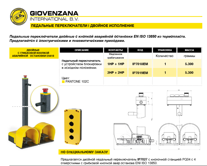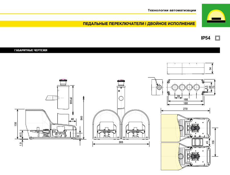 Степень защиты одинарных педальных переключателей — IP65, а двойных и с кнопкой аварийного останова — IP54. Все педальные переключатели соответствуют требованиям Директивы по машинам и механизмам и имеют знак соответствия CE.