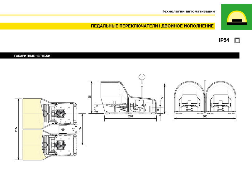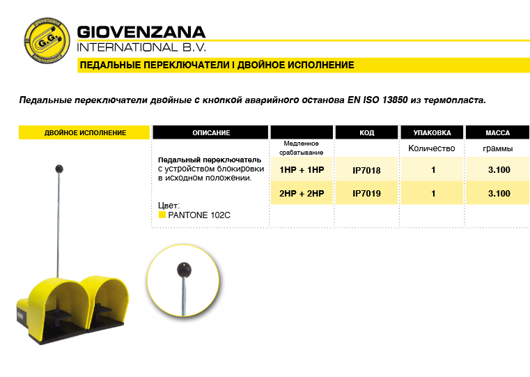 Степень защиты одинарных педальных переключателей — IP65, а двойных и с кнопкой аварийного останова — IP54. Все педальные переключатели соответствуют требованиям Директивы по машинам и механизмам и имеют знак соответствия CE.