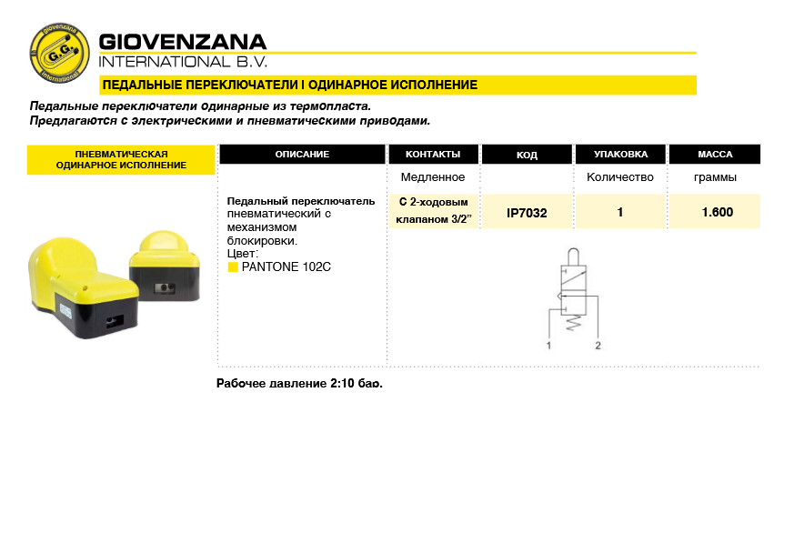 Переключатель ножной педальный IP7032 (c 2-ходовым клапаном 3/2″) – это педальный переключатель пневматический с механизмом блокировки (c 2-ходовым клапаном 3/2″).