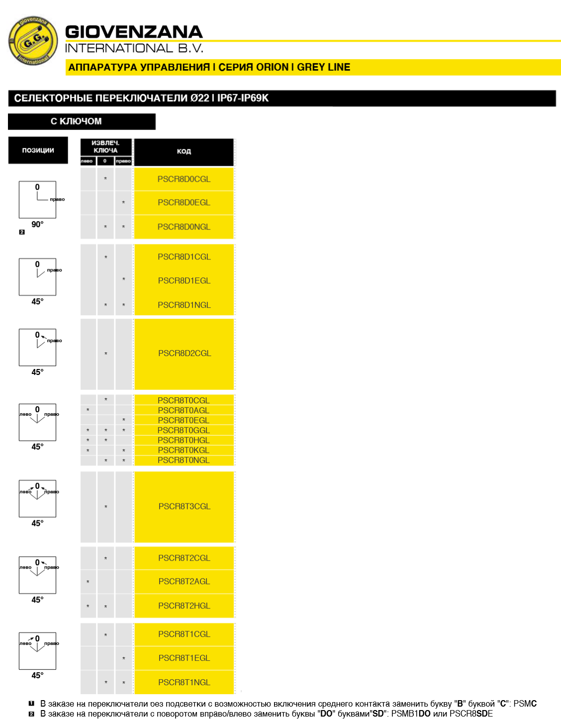Переключатели поворотные PSCR…GL серии Orion Grey имеют различные вариации исполнения:
