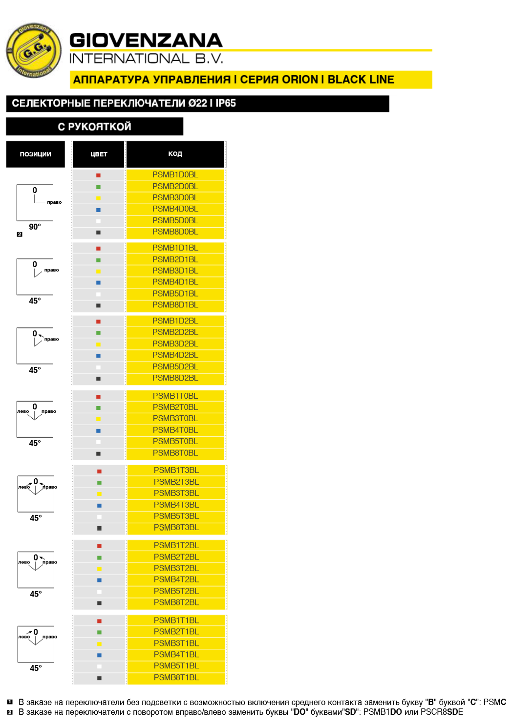 например PSMB1T2BL — переключатель с красным цветом (B1), на 3 положения 45° и самовозвратом справа (T2)