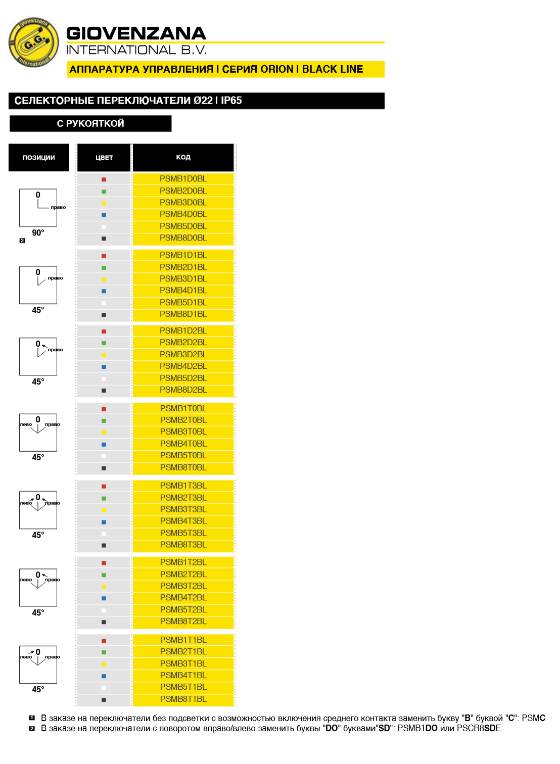 например PSMB1T2BL — переключатель с красным цветом (B1), на 3 положения 45° и самовозвратом справа (T2)