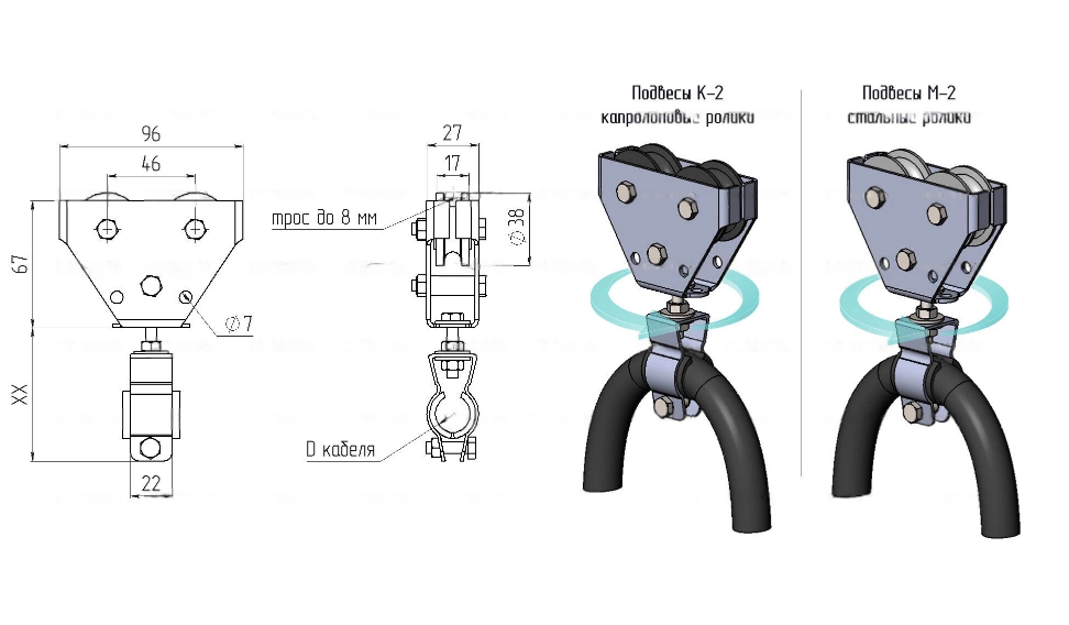 На подвесы К и М устанавливаются ролики и зажимы под кабель, разных типоразмеров: