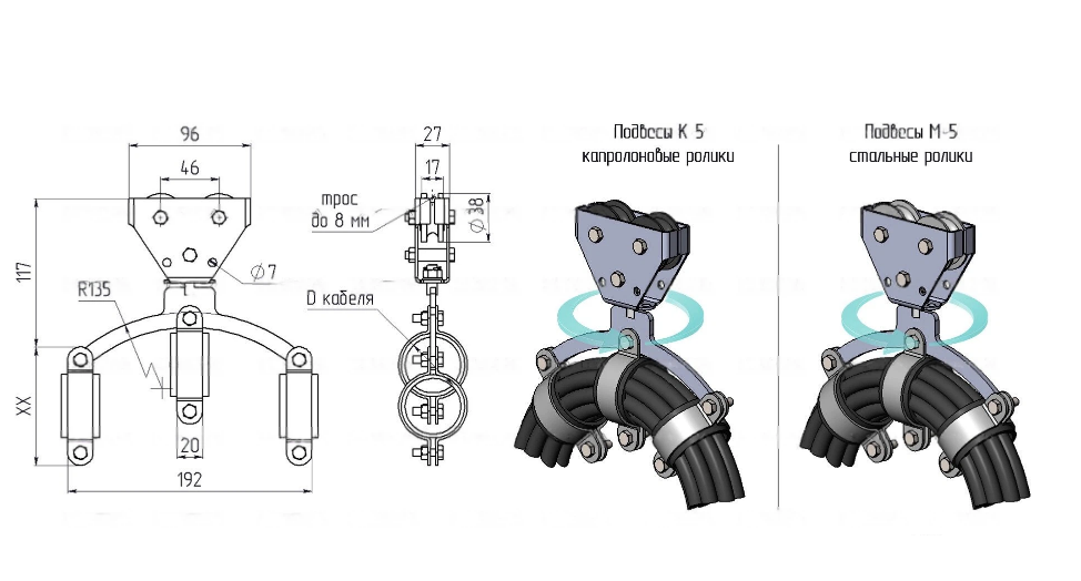 На подвесы К и М устанавливаются ролики и зажимы под кабель, разных типоразмеров: