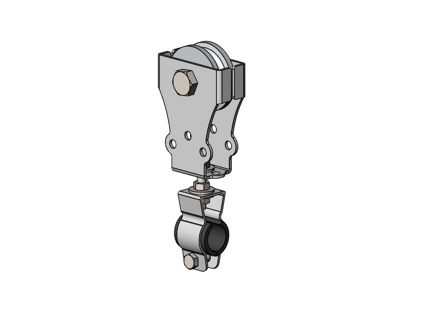 Подвес состоит из 1го стального ролика с подшипником, который закреплен в металлическом корпусе, а снизу установлен вращающийся кабельный зажим.