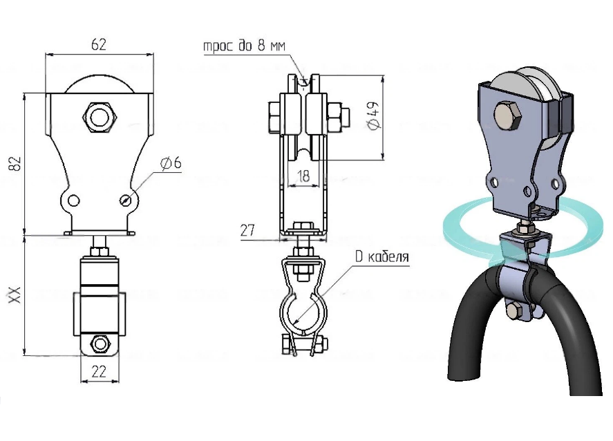 ПСКРВ (Подвес Скользящий Кабельный Роликовый Вращающийся) предназначен для перемещения питающего кабеля по тросу или струне.