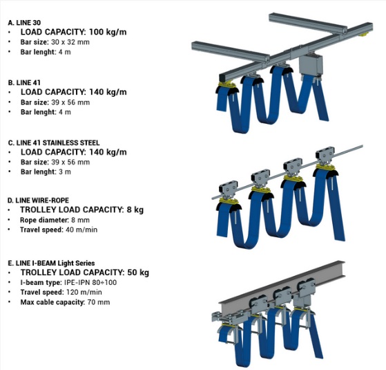 Подвесные кабельные системы – это традиционные системы передачи электроэнергии, используемые в различного рода подъемно-транспортном оборудовании. Основные области применения этой системы — мобильные потребители электроэнергии, такие, как кран, монорельс, электроподъемник, станки, системы мойки автомобилей, гальванические линии и т. д. Эта система имеет следующие преимущества: