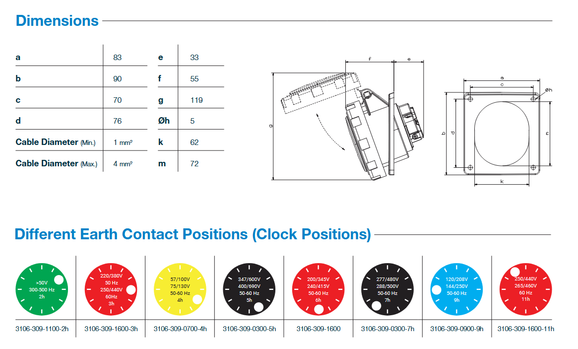 Розетка силовая встраиваемая наклонная 3Р+РЕ+N 32А 380-415В IP67