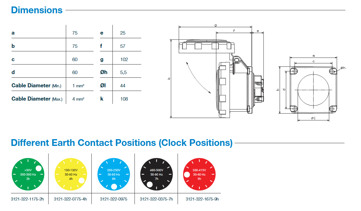 Розетка силовая встраиваемая (75х75) 2Р+РЕ 16А 240В IP67