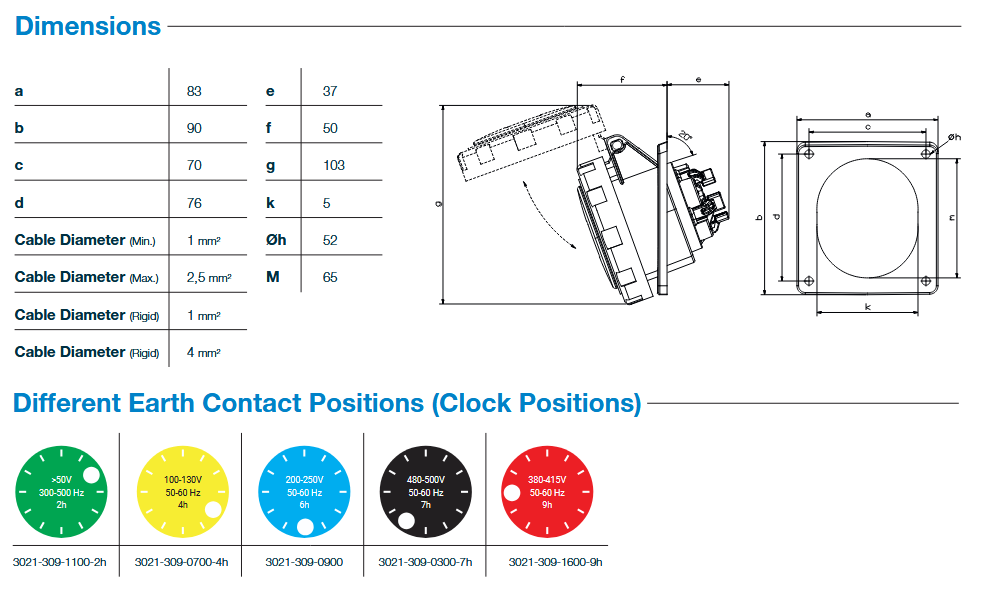 Розетка силовая встраиваемая наклонная 2Р+РЕ 16А 240В IP67