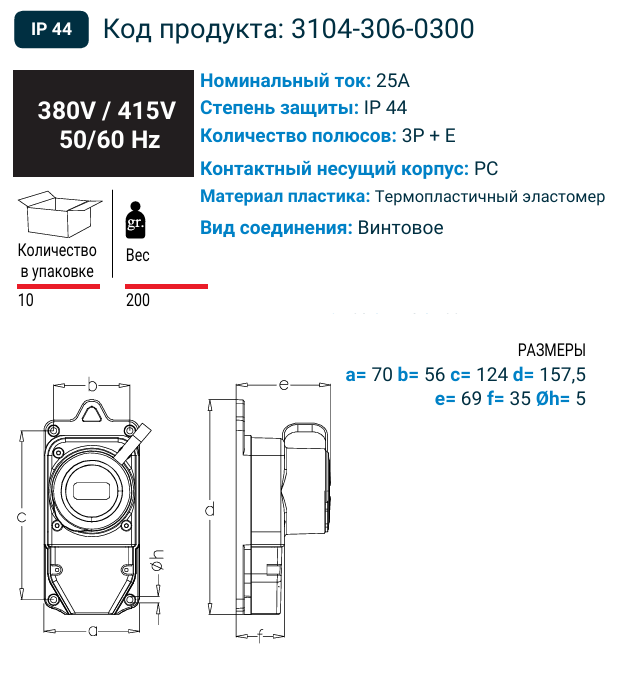 Розетка стационарная настенная каучуковая 3Р+РЕ 25А 380-415В IP44