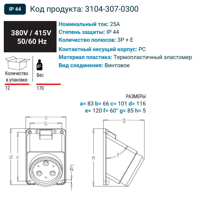 Розетка стационарная настенная наклонная каучуковая 3Р+РЕ 25А 380-415В IP44