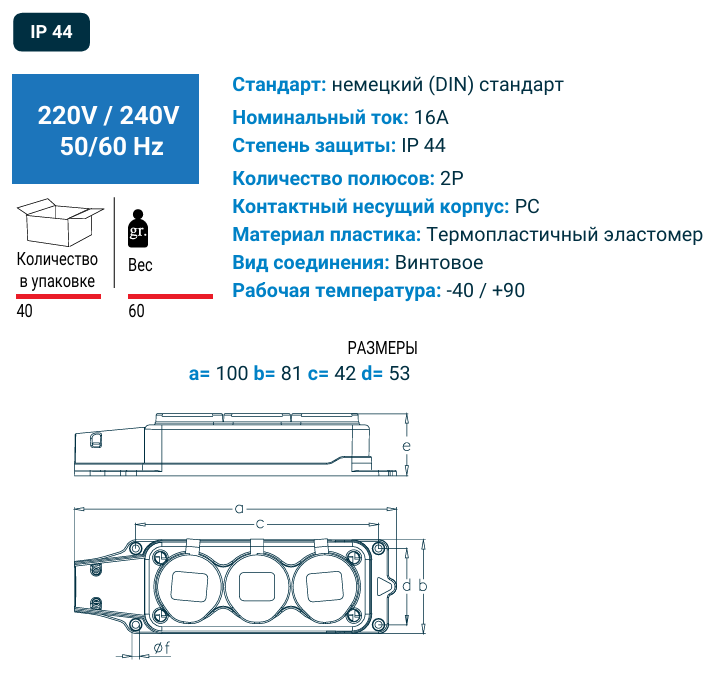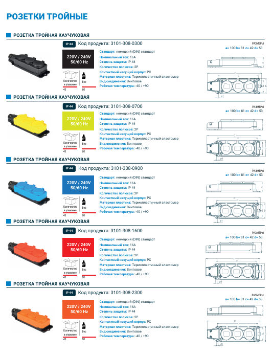 Розетка тройная каучуковая 2Р+РЕ 16А 220В IP44