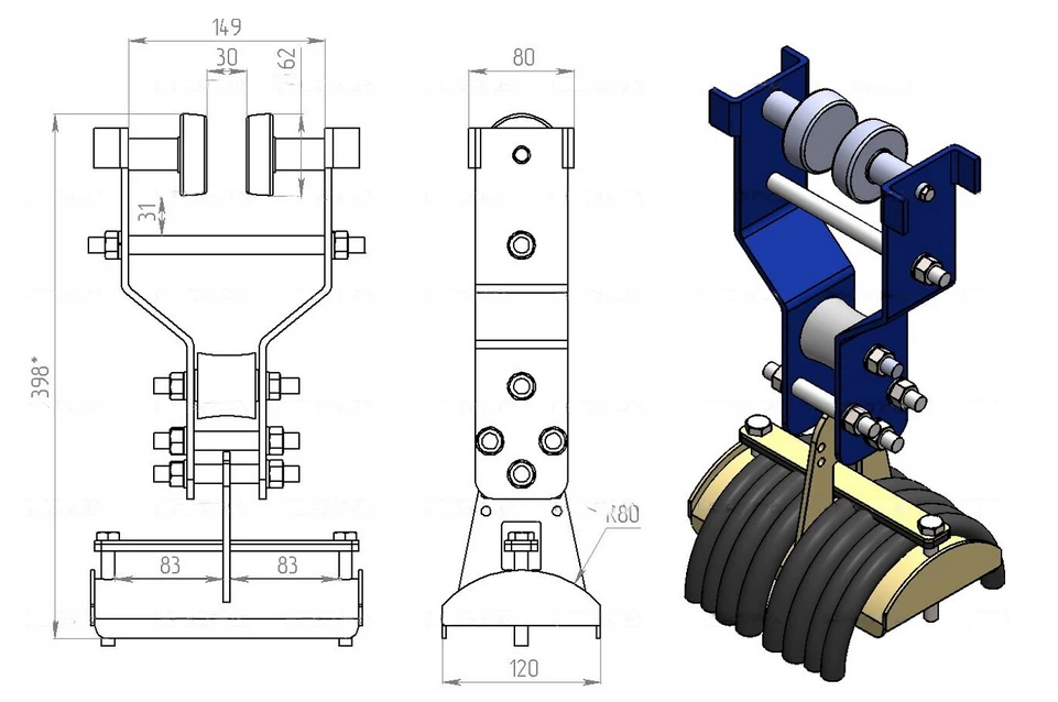 — неподвижное кабельное седло с прижимом и резиновой накладкой защищающей кабели от перетирания