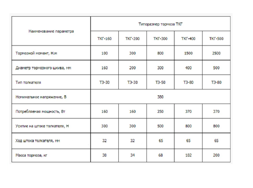 Тормоза ТКГ выпускают следующих типоразмеров ТКГ-160, ТКГ-200, ТКГ-300, ТКГ-400, ТКГ-500, ТКГ-600, где цифра означает диаметр тормозного шкива в миллиметрах. Приводом тормоза ТКГ является гидротолкатель ТЭ.