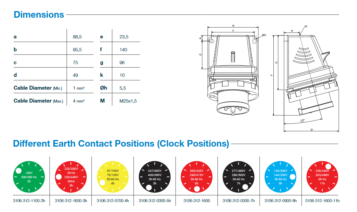 Вилка силовая стационарная настенная (70х70) 3Р+РЕ+N 32А 380-415В IP67