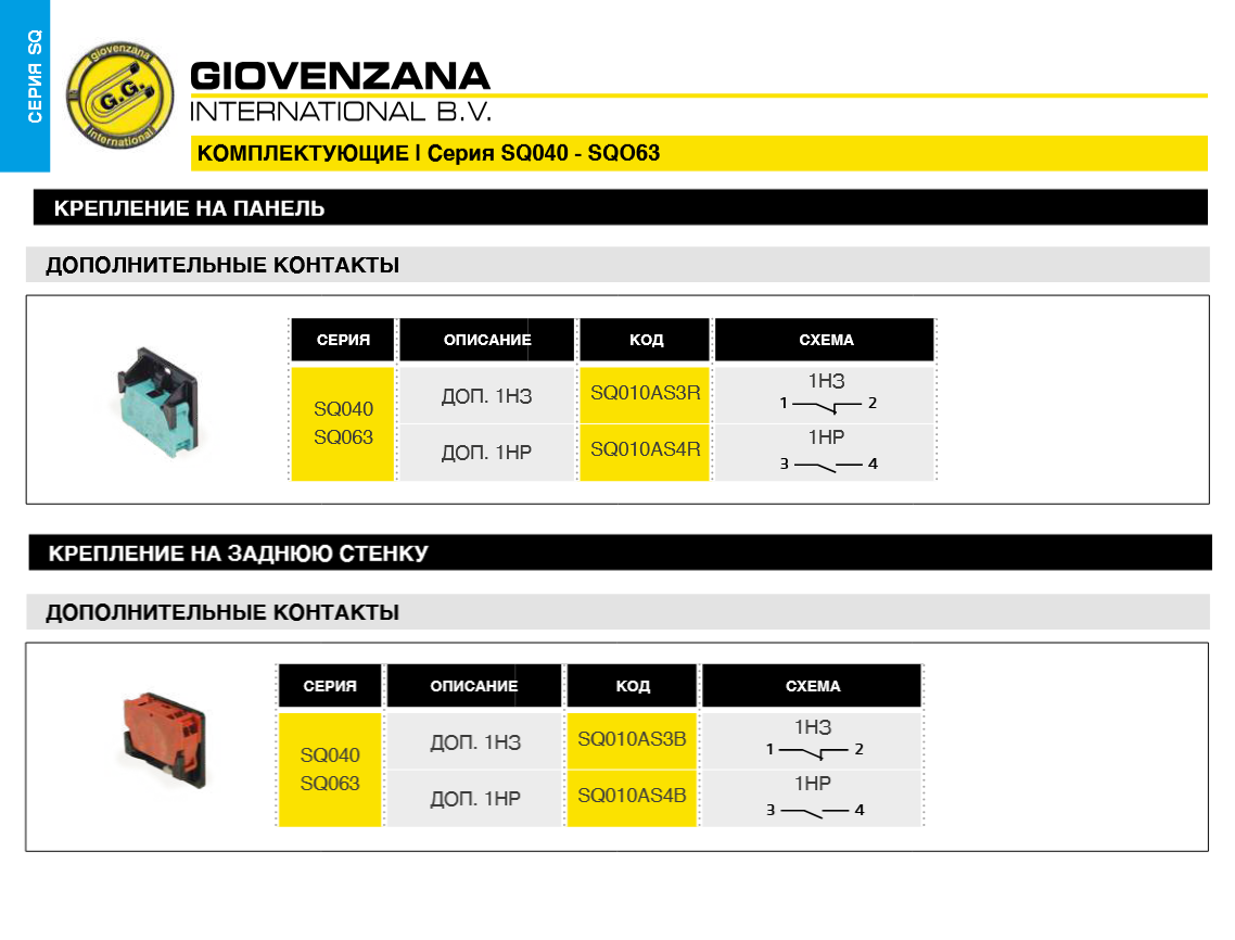 Выключатели нагрузки SQ: от 50A до 80A, 2 или 3-полюсные, можно оснащать дополнительными полюсами, дополнительными контактами и защитными кожухами с классом защиты IP20.