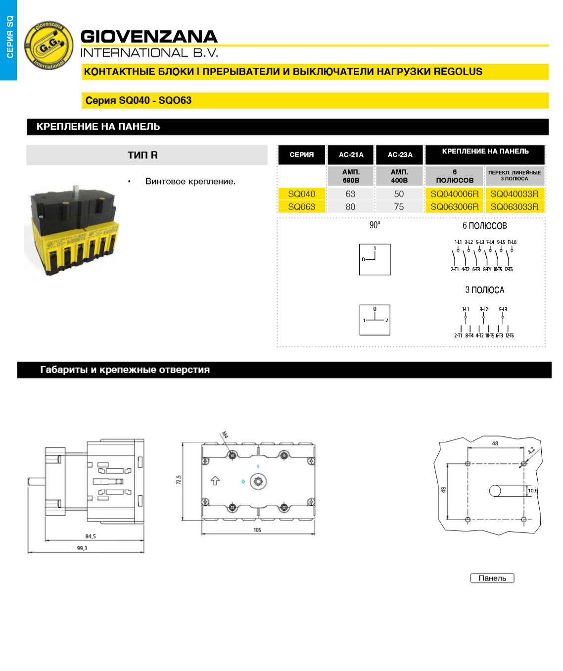 Выключатели нагрузки SQ040, SQ063 (тип R — 6 полюсов и линейные переключатели 3 полюса)